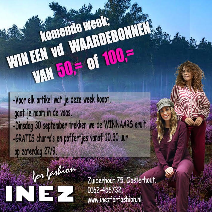 Win een waardebon van €50 of €100 bij Inez for fasion! Voor elk artikel dat je deze week koopt gaat je naam in de vaas. Op dinsdag 30 september worden de winnaars gekozen. Geniet daarnaast op zaterdag 27 september van gratis churro's en poffertjes vanaf 10:30.
